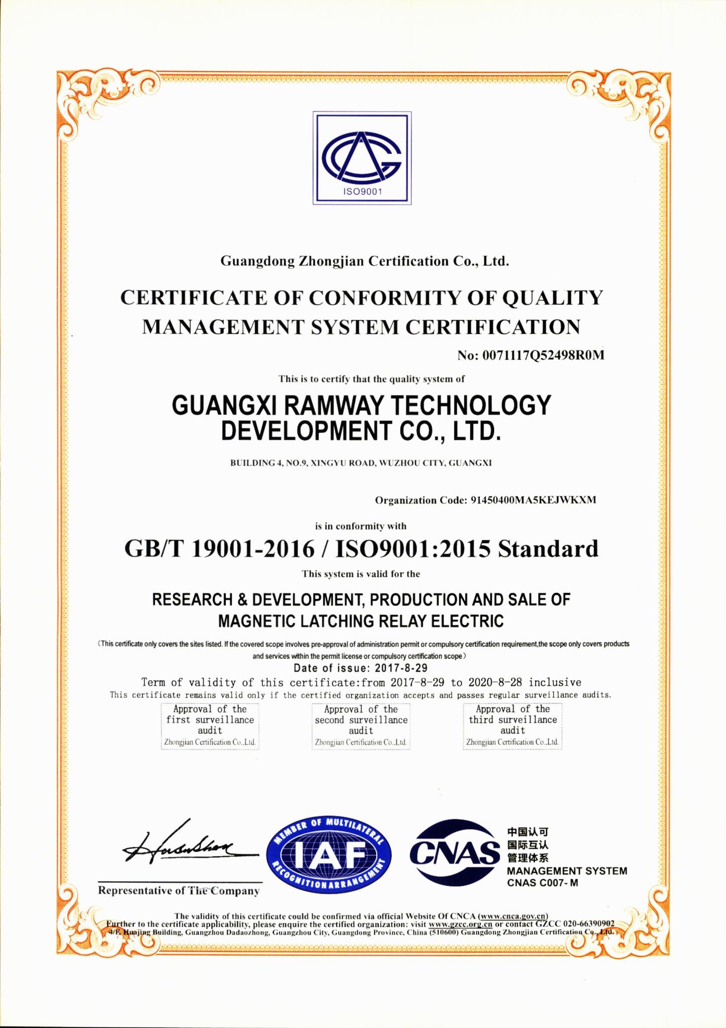 4 ISO9001:2015 - 广西睿奕科技开发有限公司 GUANGXI RAMWAY TECHNOLOGY CO LTD latching relay magnetic relay