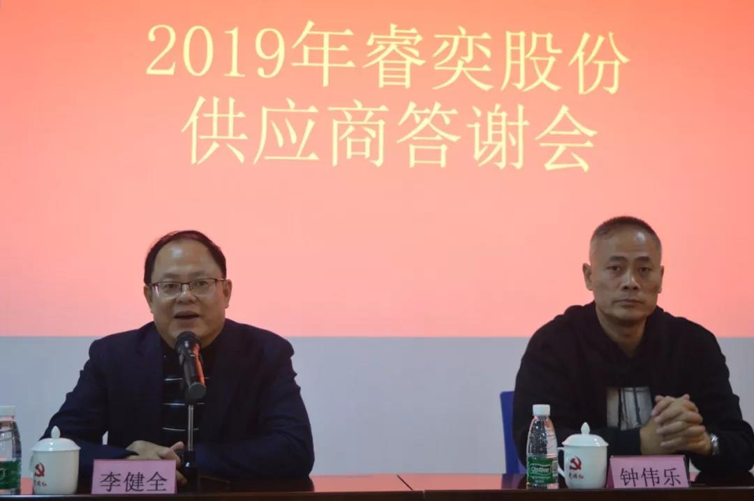 李健全董事长在会议做了主题发言:感谢各位供应商在2019年对睿奕集团的大力支持,睿奕集团在2019年依然保持着超过60%高速增长,良好的发展态势下,睿奕已经在上市辅导进程中,在2020年,睿奕集团的发展还需要供应商在质量、交期、价格上给予支持,现在竞争激烈的市场环境下,只有供应商和睿奕共同努力,合作共赢才能支持睿奕以具有竞争力的产品开拓市场。